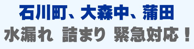 石川町、大森中、蒲田での水の困った即解決!急な水道トラブルに緊急でかけつけ訪問し、蛇口の水漏れ、トイレ詰まり、排水の溢れ、タンクの故障など修理いたします。