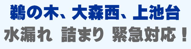 鵜の木、大森西、上池台での水の困った即解決!急な水道トラブルに緊急でかけつけ訪問し、蛇口の水漏れ、トイレ詰まり、排水の溢れ、タンクの故障など修理いたします。